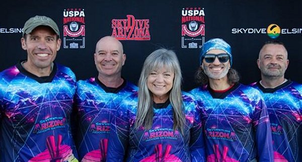 Etienne (Tail) and daughter Hannah (Inside Center) were the rear piece for Florida team Relentless (Flaviane Venditti, Brian Babernitch, Patrick Kessler on camera), and they won their next USPA silver medals in the next 4-way category. Flaviane Venditti trained and competed with XP Falcons in 2024 and finished again in 2nd place. Brian Babernitch, CitiZens member of 2023 and 2024, switched from Point to Outside Center. Only the highly experienced Spaceland Toxic lineup finished ahead of the Skydive City team.