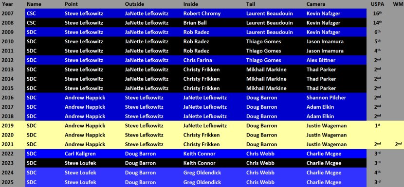 The same Rhetirement Rhedux lineup had competed at the USPA Nationals 2024 and now confirmed the comeback from retirement. Christy Frikken, JaNette and Steve Lefkowitz had spent three years together before Doug Barron and Andrew Happick replaced Christy Frikken and Mikhail Markine. Doug Barron then spent the FAI Tanay Mondial year with Christy Frikken and Steve Lefkowitz before he began re-building the team in 2022. He will probably continue with his own Rhythm lineup, as Christy Frikken, JaNette and Steve Lefkowitz don't seem to have any athletic plans beyond the Rhetirement Rhedux.