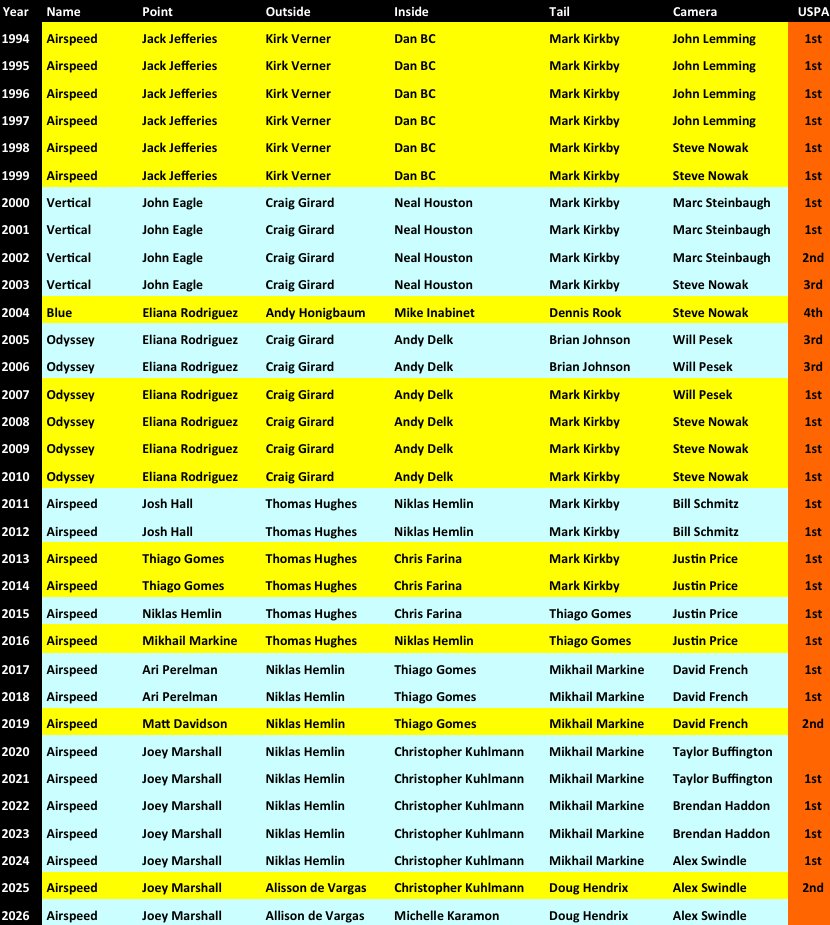 The same Arizona Airspeed lineup—Niklas Hemlin, Mikhail Markine, Chris Kuhlmann, and Joey Marshall—claimed two consecutive world championship titles in 2022 and 2024, flying once with Brendan Haddon on camera and once with Alex Swindle. Given the five-year run of the reigning 4-way outdoor world champions, it was not a major surprise that a lineup change would follow.