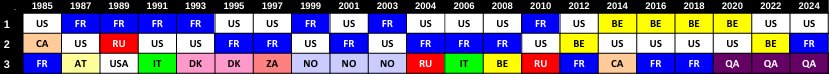 The most recent French names engraved on the William H. Ottley Sword for 4-way world champions—also known as the 4-way Excalibur—belong to the 2010 world champions: Guillaume and Mathieu Bernier, Julien Degen, Jérémy Rollett, with Olivier Henaff on camera. It was the same event where Mathieu Bernier uniquely accomplished the double-gold feat.